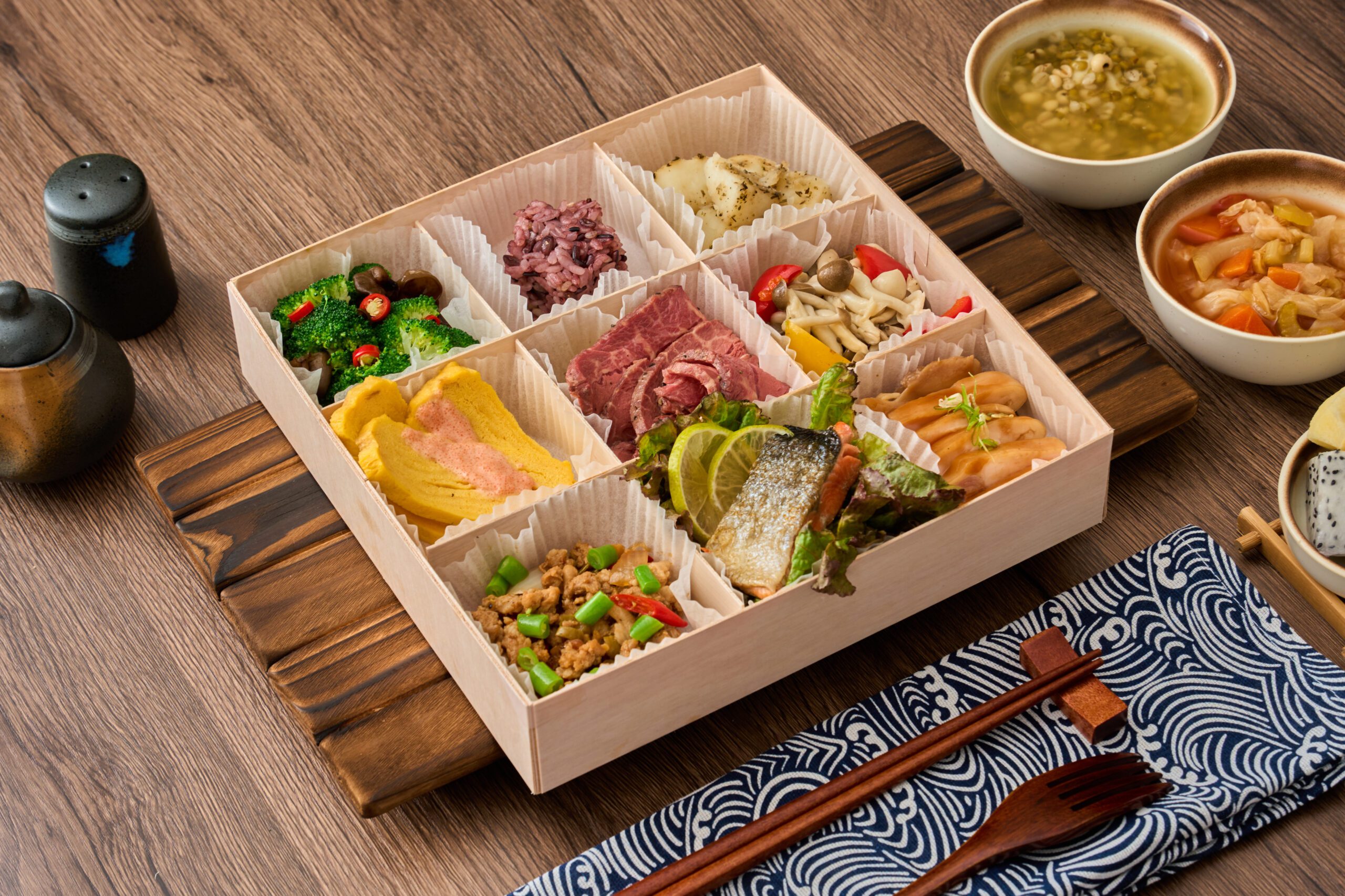 採用九宮格設計的餐盒,利用了心理學上的「多樣性效應」。當眼前呈現出八、九種不同顏色、口感與風味的食材時——也許是一格鮮綠的水蓮、一格金黃的骰子牛、一格紅潤的番茄羅宋湯——大腦會接收到「我吃得很豐富」的訊號,這種滿足感能有效抑制飢餓素的分泌,實際上,御膳九枡天宴雖然熱量控制精準,但因為食材多樣,吃完後的心理滿足度往往高於一份熱量爆表但口味單一的炒飯。